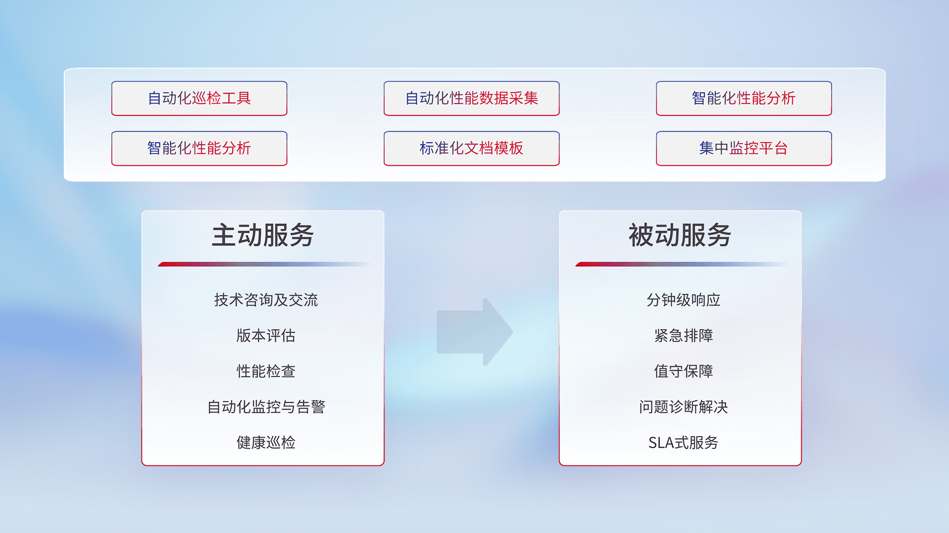 智能化工具和标准化文档,,,保障服务质量,,,提供主动服务(包含技术咨询、、版本评估、、、性能检查、、、自动化监控与告警、、、健康巡检)和被动服务包含(分钟级响应、、、紧急排障、、、值守保障、、问题诊断解决、、SLA服务)。。。